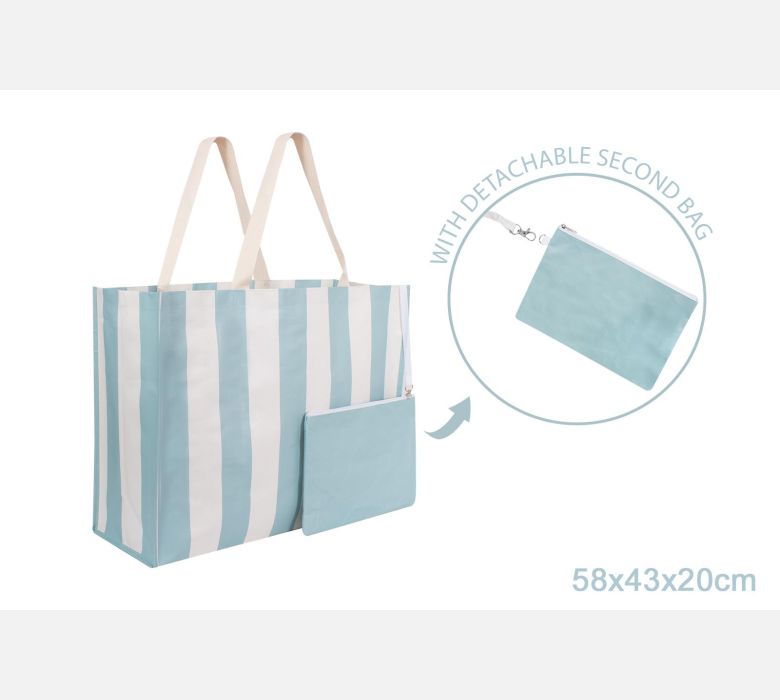 This woven beach bag with integrated clip purse is a great addition to any summer collection, made from 160gsm woven PP material with detachable purse, two cotton handles for easy carrying and a stripe print design.