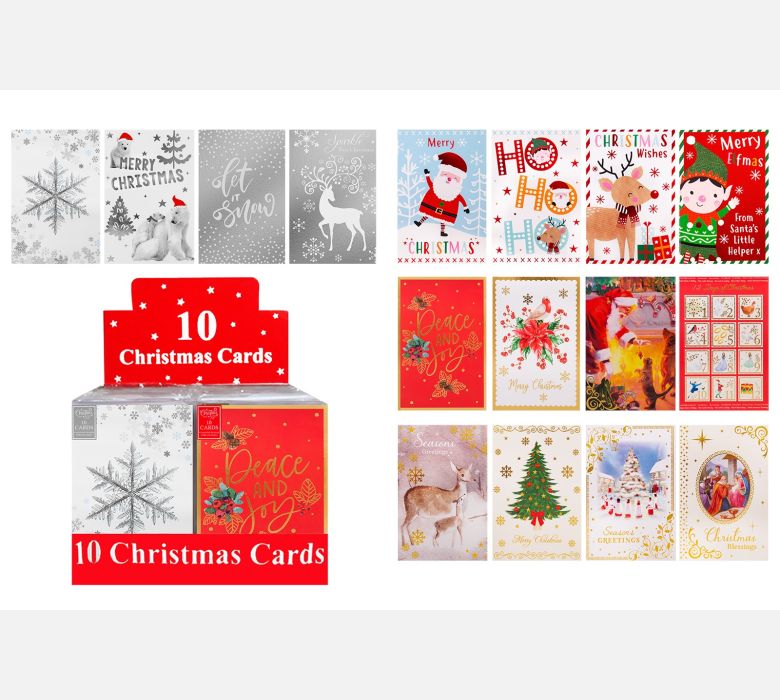 This pack of ten cards is a great addition to any christmas collection, made from high quality card featuring two assorted festive designs in each pack and includes ten white envelopes.